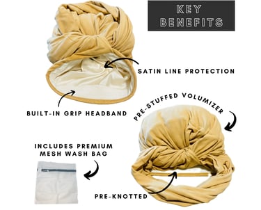 The built-in velvet grip headband ensures the headwrap stays firmly in place and protected throughout the day.
